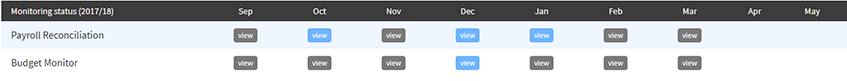As one of our staple functions, the Monitoring Status provides a straight-forward overview of SBS Online monitoring on the whole and reconciliations yet to be completed. To save users' time it also enables a shortcut to the monthly Budget Monitor and Payroll Reconciliation. To further benefit the user, we have improved the Monitoring Status on the new planner dashboard. Previously, for the colour statuses, we had Blue for when data had been imported into the Payroll Reconciliation or Budget Monitor and Grey for empty. For the redesign, we are introducing an Orange colour status. Orange will be the status all for non-reconciled months up to (and including) the current month, with the remainder of the budget year showing as Grey. Blue will still be the indicator for months where the payroll has been imported, meaning that when planning upcoming tasks, the user will have a clear overview of the months (in Orange) yet to be completed. As before, clicking 'View' under the month symbol provides a shortcut to the complete data for that month.